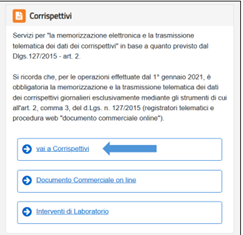 - Clicca il link "vai a Corrispettivi" presente nella sezione "Corrispettivi", che si trova nella pagina principale del portale "Fatture e Corrispettivi".