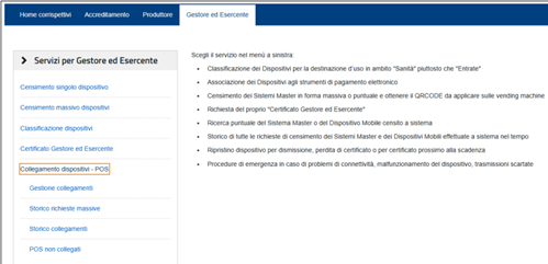 - Clicca il link "Collegamento dispositivi – POS" disponibile nel menu a sinistra.