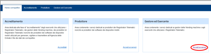 - Clicca il link "Accedi ai servizi", nella sezione "Gestore ed esercente", per accedere all'area dove sono disponibili i servizi dedicati ai commercianti e agli operatori.